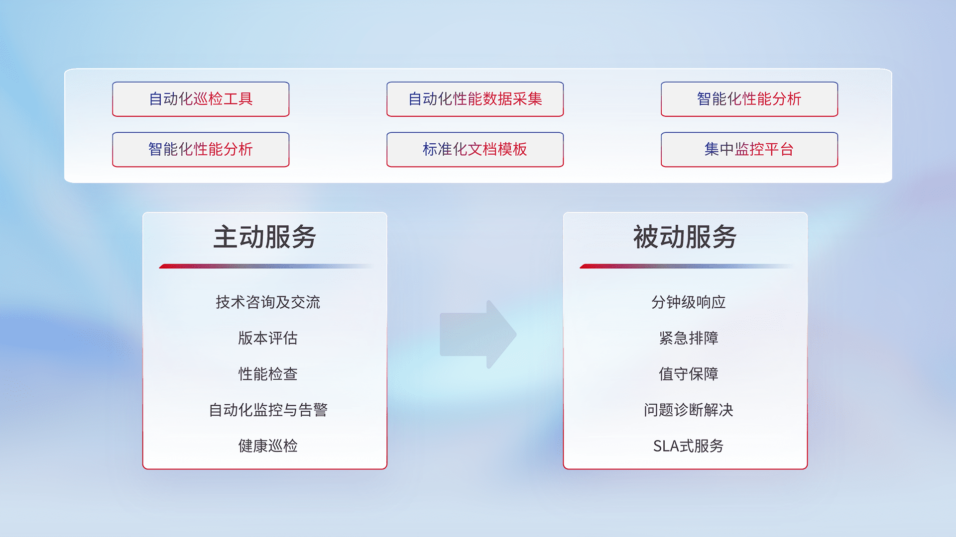智能化工具和标准化文档,,,,保障服务质量,,,,提供主动服务(包含技术咨询、、、、版本评估、、性能检查、、自动化监控与告警、、健康巡检)和被动服务包含(分钟级响应、、、、紧急排障、、、、值守保障、、问题诊断解决、、SLA服务)。。