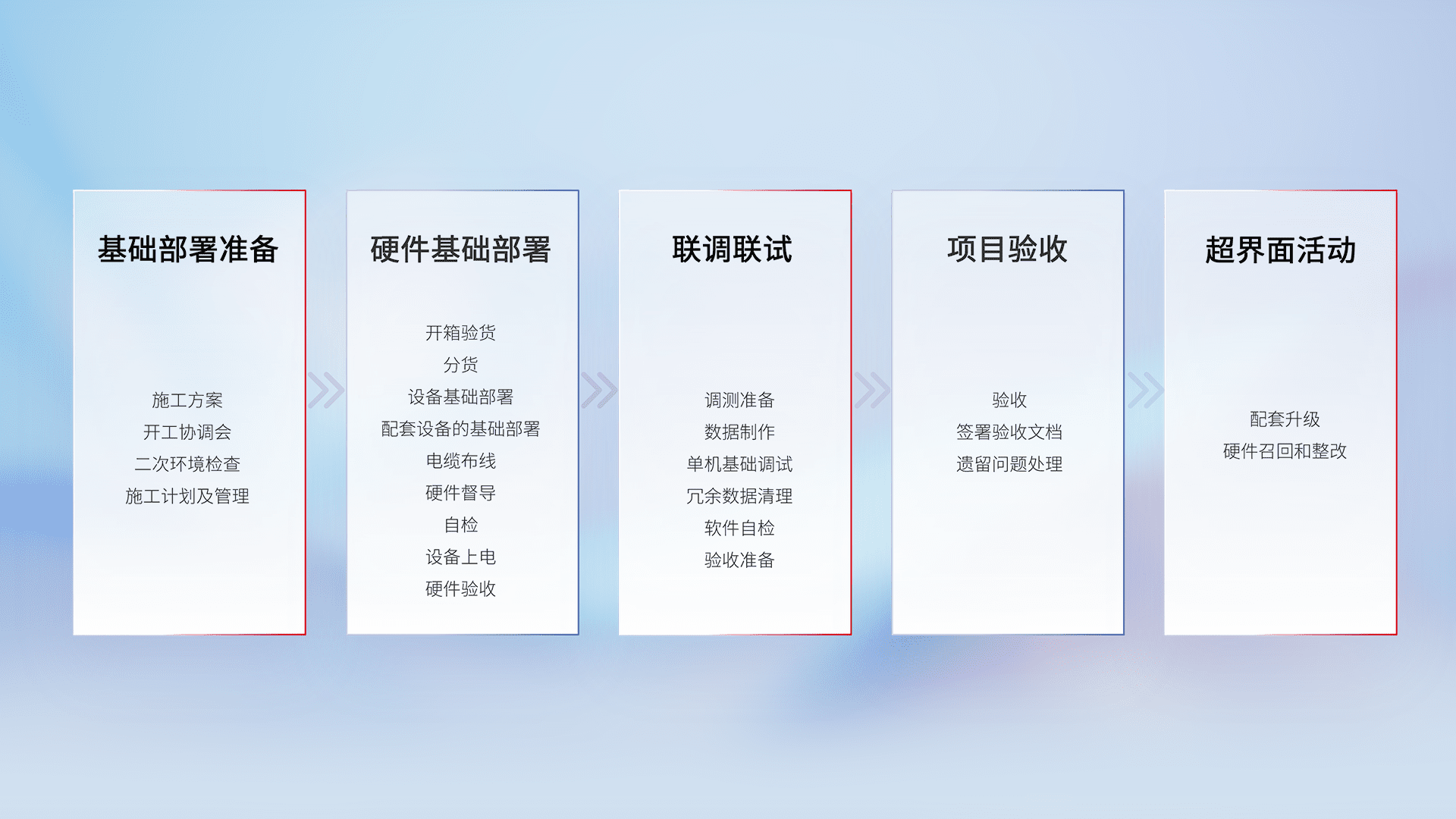 从基础部署准备、、硬件基础部署、、联调联试、、项目验收、、、、越界面活动的全过程可追溯,,保证施工质量和进度。。。。
